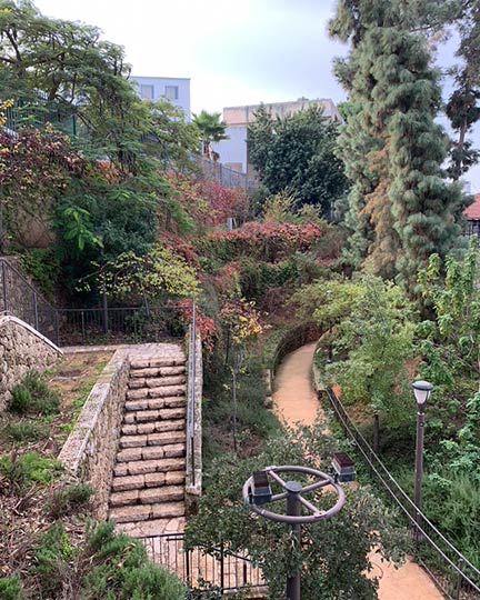 בתמונה, אלו לא הגנים הבהאים אלא חלקו המערבי של גן אברהם שתוכנן ע”י משה כבשני ועבר שיפוץ בשנת 2010, שהחזיר עטרה ליושנה .